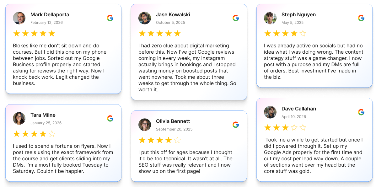 20 Minute Marketing is Australia's only structured digital marketing course built specifically for small business owners. Every lesson is 20 minutes long. Every strategy is designed for Australian businesses. Every course is backed by a satisfaction guarantee.